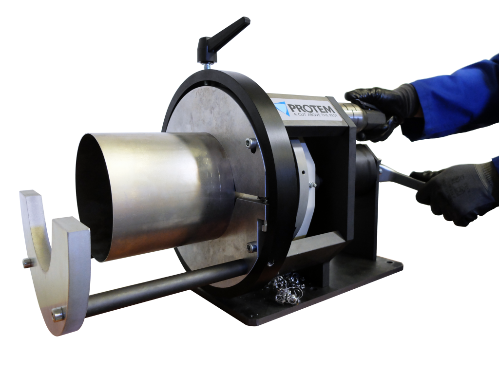 The pneumatic or electric powered Tube & Pipe end preparation machine PROTEM SE-NG Series are lightweighted and portable. It will perform repeatable perfect quality weld preps on all metal tubes and pipes including mild, stainless steel, exotic alloys such as inconel, P91, hastelloy, copper etc… The SE-NG Series allows to cover diameters ranging from 0.393“ to 8.622“ (10mm-219mm). The cutting head will face, bevel and counterbore individually or in a simultaneous operation. The toolholder plate can hold up to 4 tool blocks.